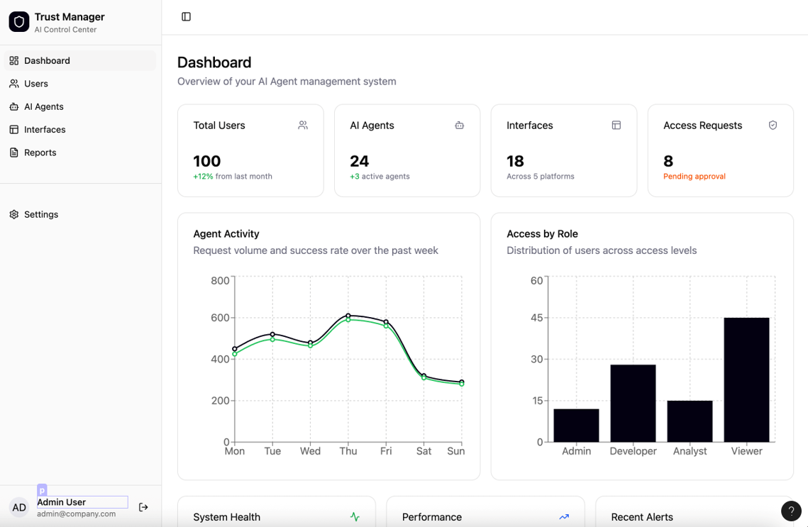 Trust Manager consolidates management of users, AI agents, interfaces, and reports into a single, intuitive dashboard, ensuring interactions remain secure, transparent, and aligned with policies.